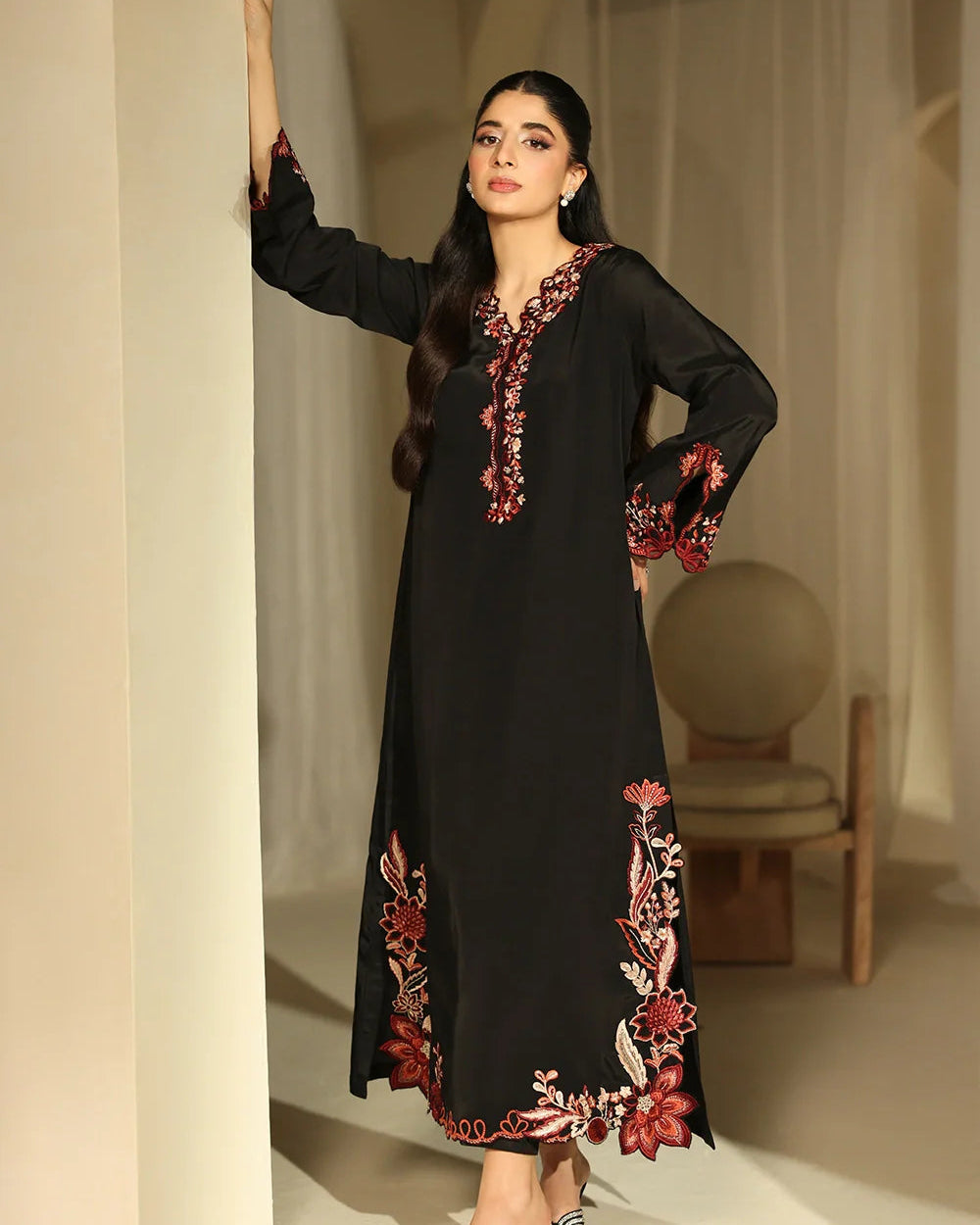 This classic black kaftan is crafted from premium raw silk and paired with straight trousers for a clean, refined look. The relaxed kaftan silhouette offers effortless elegance, while the smooth raw silk finish adds a subtle, luxurious sheen. Perfect for everyday wear with a touch of sophistication.