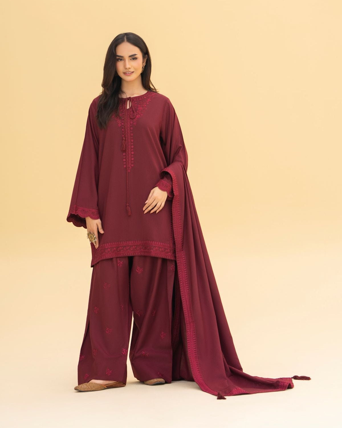 Step into timeless grace with Crimson Majesty by SAFAYA OFFICIAL. This deep maroon ensemble exudes regal charm, featuring an exquisitely embroidered shirt paired with a beautifully crafted farshi shalwar. The intricate detailing on Ayudia Karandi fabric reflects pure sophistication and tradition. Completing the look is a matching embroidered shawl that adds an aura of luxury — perfect for festive gatherings and elegant winter soirées.