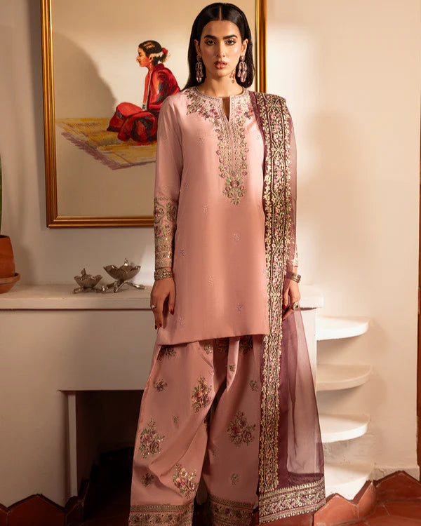 The shirt, crafted from luxurious tassle silk, features a soft lilac hue, enhanced by elegant detailing and stylish embroidered motifs on the neckline, creating a look of refined charm. Paired with a matching lilac embroidered floral trouser, adorned with intricate borders, this outfit exudes graceful elegance. The look is completed with a stunning contrast dupatta, rich in detail, with heavy embroidered borders that add a touch of drama and opulence.