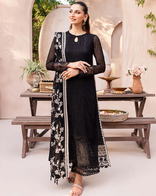 Introducing Starry Bliss, the luxurious midnight black dress with sequins embroidered chiffon on the front and on the sleeves. The chiffon back is dyed for rich color. With 5 meters of sequins embroidered organza front and back side laces. Paired with a 2.5-yard contrast embroidered chiffon dupatta, this dress is sure to make you stand out. Includes inner fabric and 2.5 yards of Grip Trouser for the bottom.