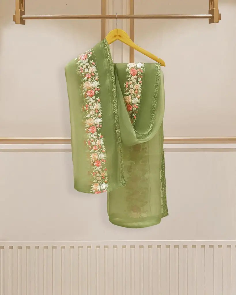 Our dupatta is no less than a work of art itself. It's adorned with vibrant, multi-color thread embroidery that adds a splash of personality to your outfit. This masterpiece is designed to complement your style effortlessly.